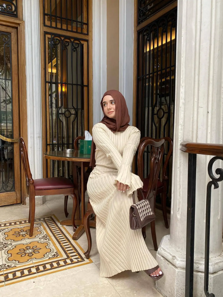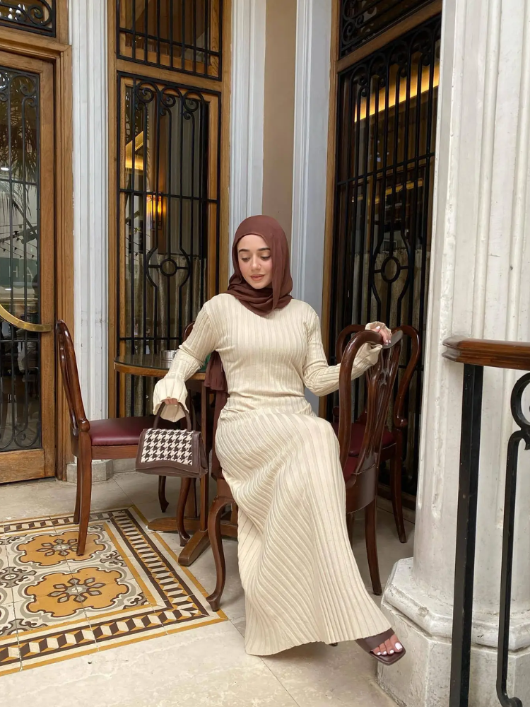 Voel jezelf meteen zelfverzekerd met een strakke, elegante look die comfort toevoegt aan elke dag. Een lange gebreide jurk met plooidetails omarmt het silhouet en biedt een zachte stretch voor een vlekkeloze pasvorm. Ideaal voor zowel formele als casual gelegenheden, zodat je altijd stijlvol voor de dag komt.