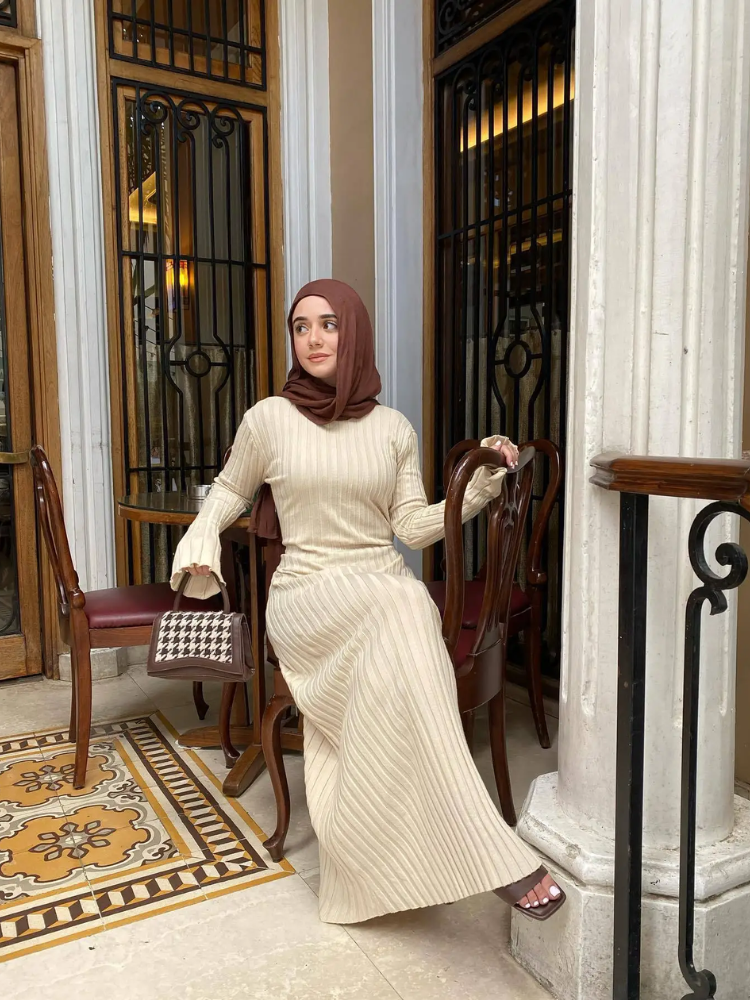- Stijl: Lange gebreide jurk met plooidetails