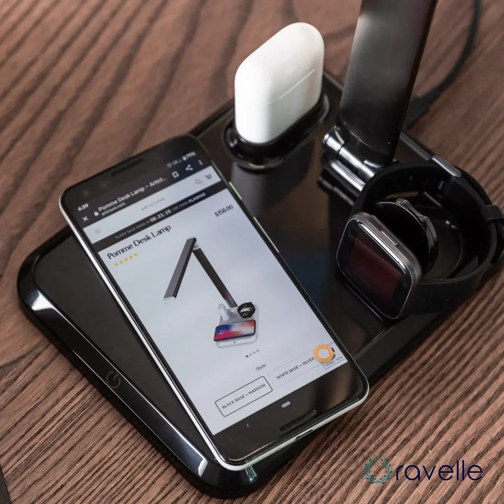 - 4-in-1 functie: Draadloos opladen voor telefoon, AirPods, Apple Watch én een ingebouwde LED-lamp.
